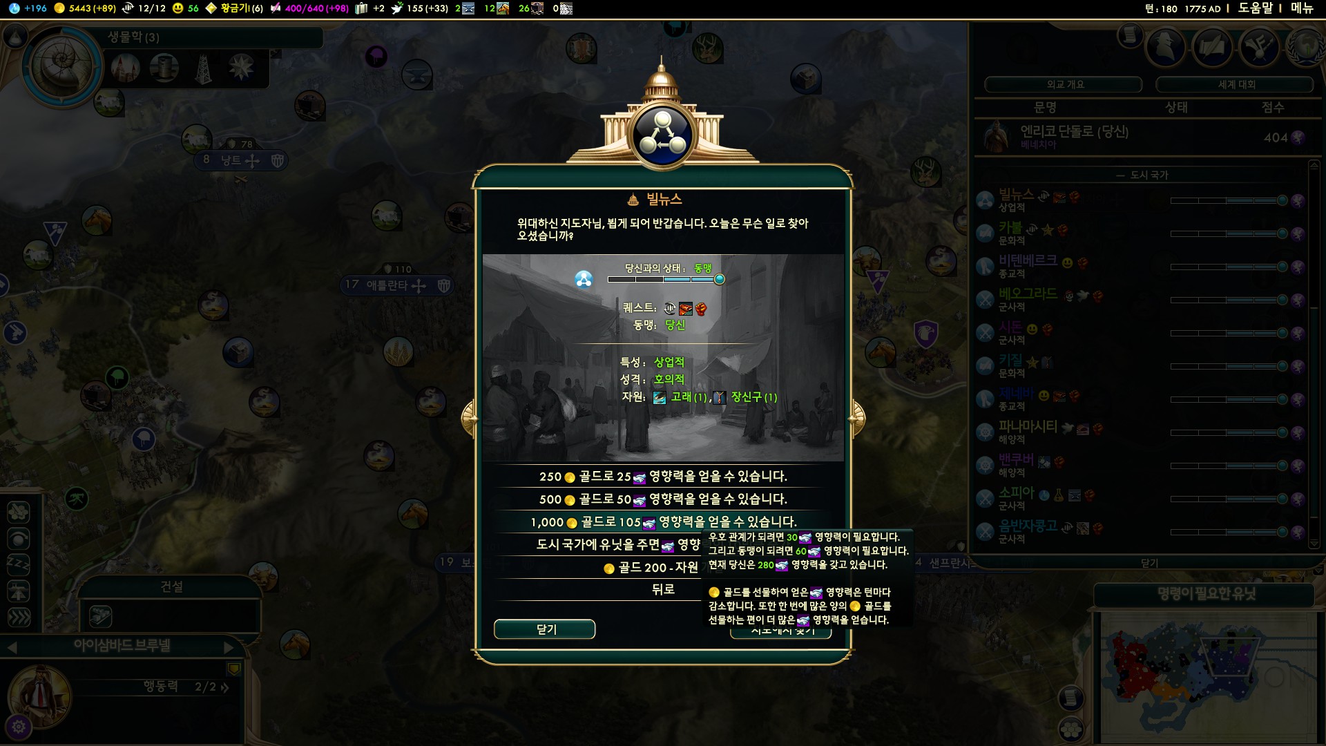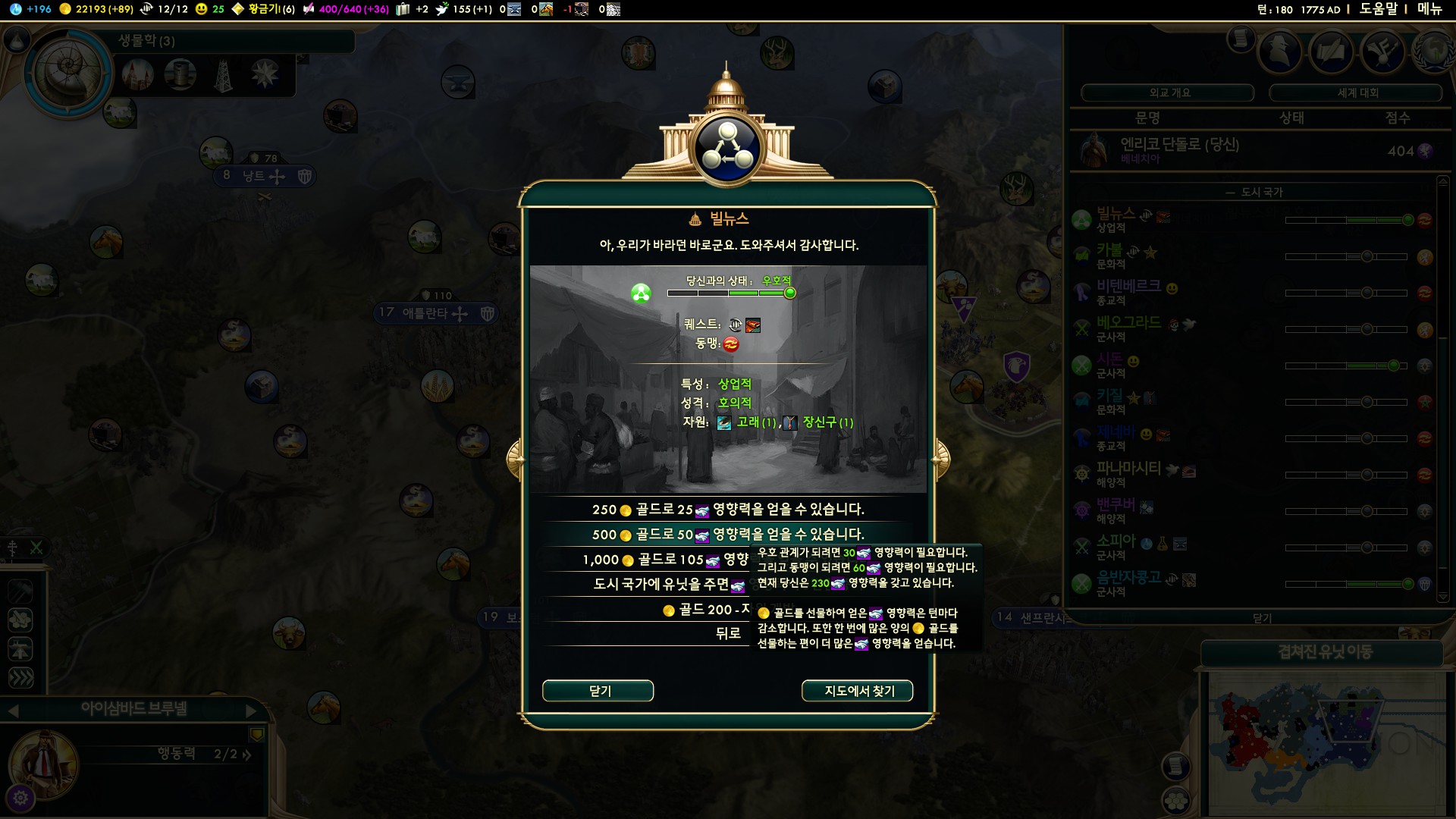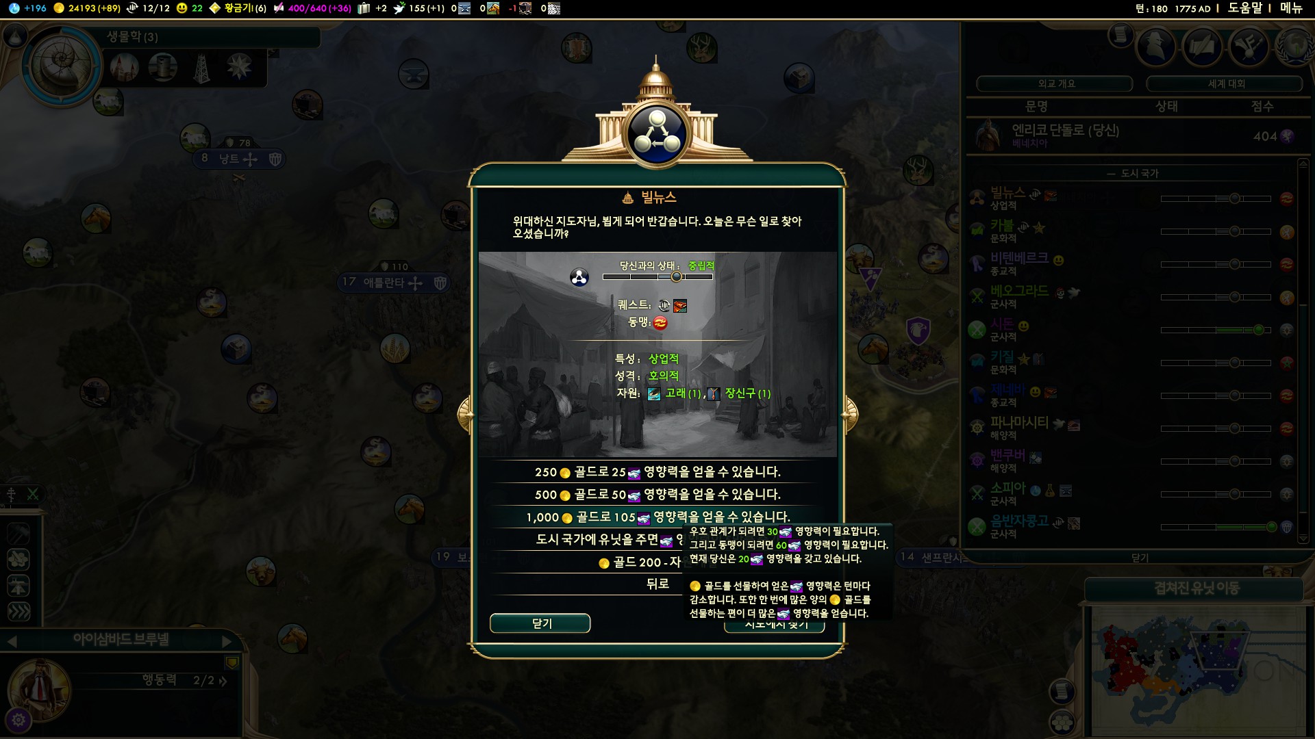 현재 맨 처음 도시국가는 254의 영향력이 필요하군요.