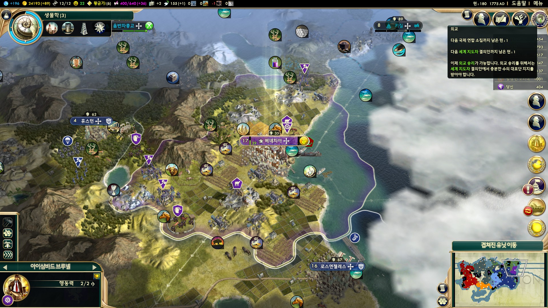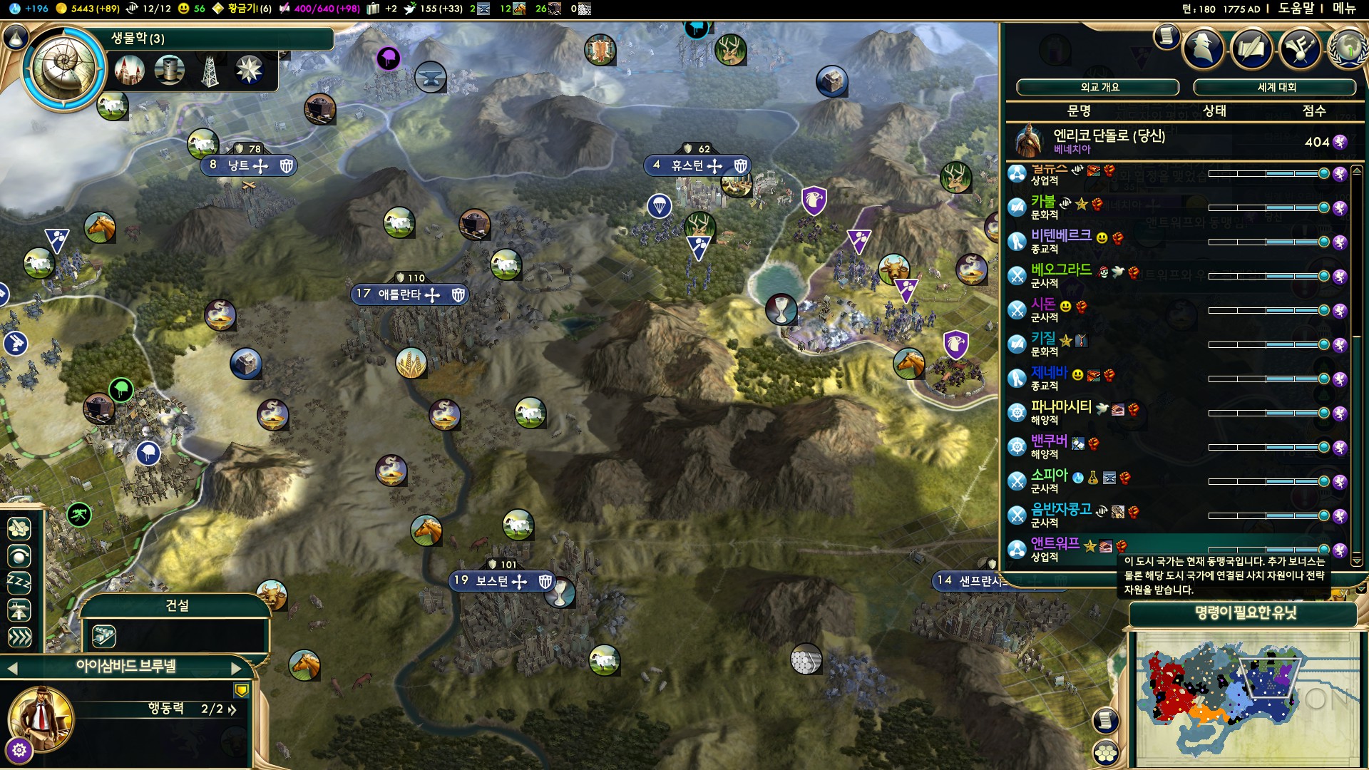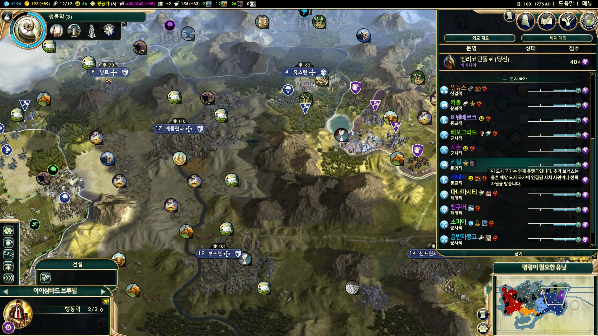 동맹이 완료되었습니다! 이런식으로 한 도시국가 한 도시국가 차례차례 매수해 주시면 됩니다!