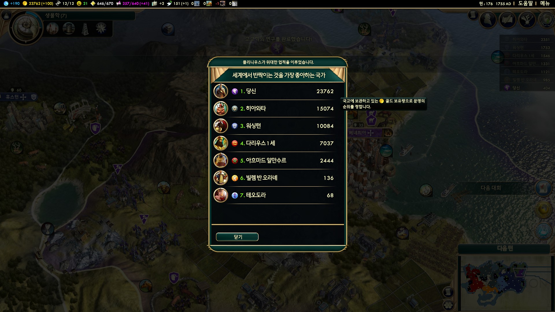 그래도 괜찮습니다. 저기 보시면 저의 재산은 23762골드... 어떤 국가보다 부자입니다.